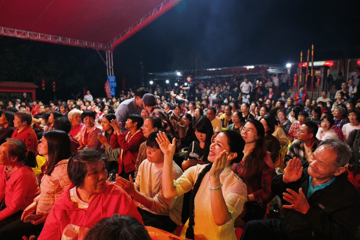 雨后空气微凉,广场却热度升腾。灯光在竹林下交相辉映,鼓点一起,掌声迅速铺满广场,每一个节目都唤起数次掌声和欢呼声的浪潮,在山间响动。